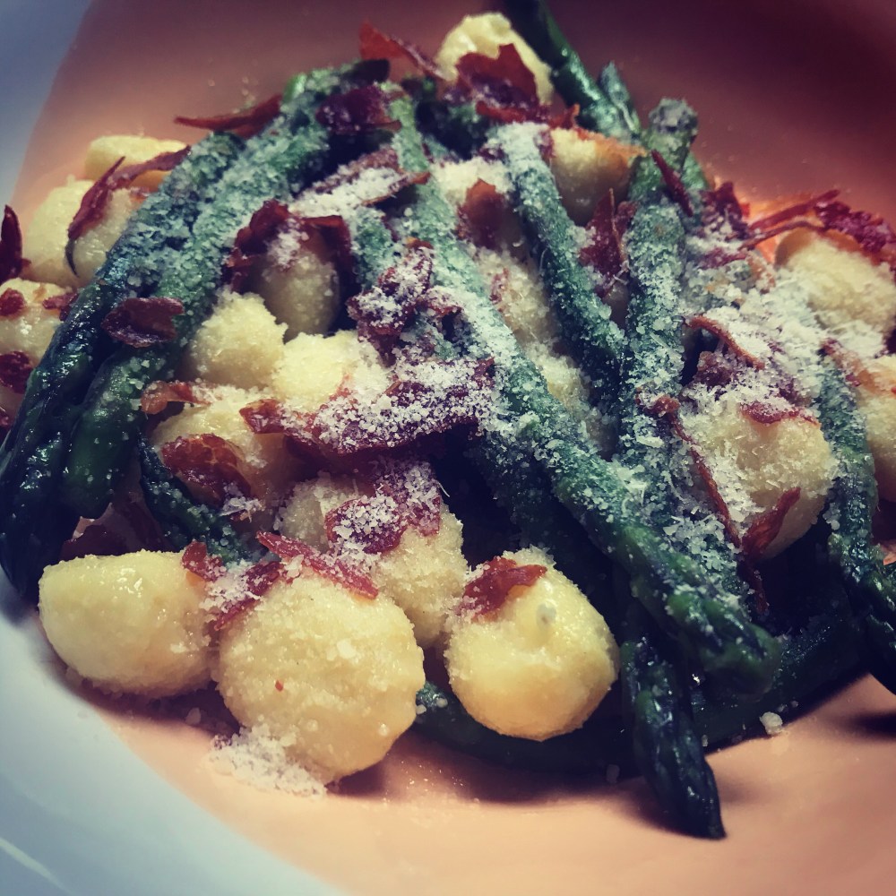 I then served the garlicky gnocchi and asparagus in bowls, crumbled over the prosciutto and sprinkled over the grated Parmesan.