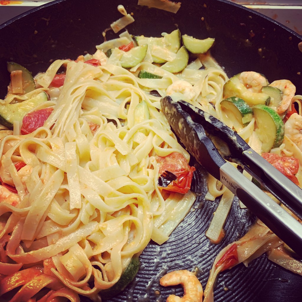 When the pasta had just under two minutes left to cook, I added the prawns to the pan with the vegetables. When there was one minute left of cooking time I filled a mug with the pasta cooking water and put a colander in the sink ready.