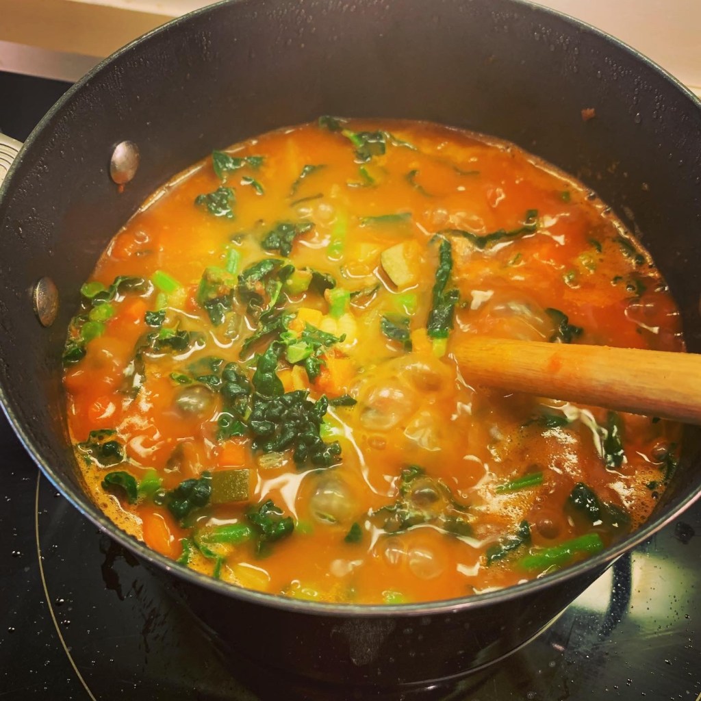 This was one of those lunches that you make slightly because you feel like you ought to make something healthy, but ended up being thoroughly enjoyed not just by me but by my husband who isn’t that keen on either soup or meat-free dishes. It was a joy to make and to eat and very much ended up being more than the sum of its parts. It had the added bonus of being low calorie and extremely healthy, but it didn’t seem like diet food when you were eating it. It did take about 45 minutes (although most of that is simmering) so it wasn’t the quickest lunch dish.